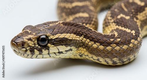 © NguyenHaiPhuong, Fototapeta premium 美しいヘビのクローズアップ写真 白背景の上で横たわる茶色と黄色の縞模様のヘビ
