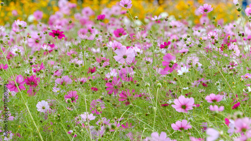 Naklejka premium 秋の野原に咲き誇るピンクのコスモスの群生