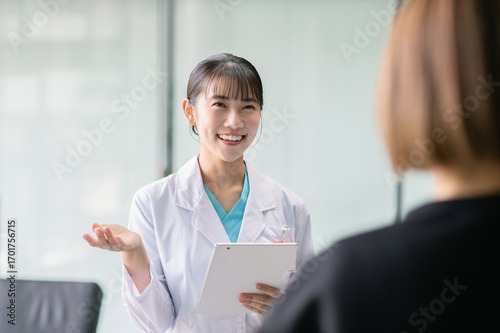 Obraz premium 患者を問診する若い女性医師「撮影協力:スカパー東京メディアセンター」