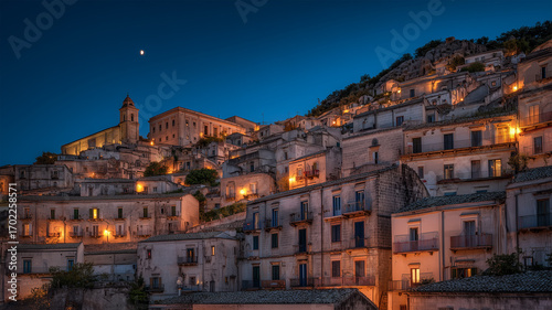 Obraz premium 初冬の丘の村に灯る静かな家々の夜景の風景