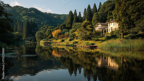 Fototapeta premium 夕暮れの湖畔の家と森が輝く夏の穏やかな景色