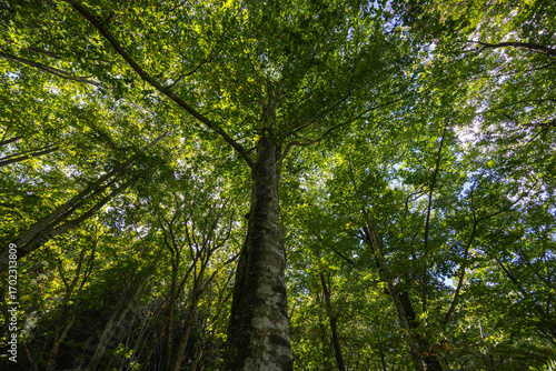 Fototapeta premium 白神山地の木漏れ日が差す森の中で見上げるブナの木