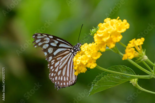 Fototapeta premium 黄色いランタナの花にとまるリュウキュウアサギマダラの蝶