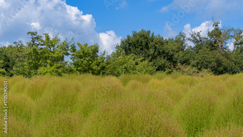 Obraz premium 夏空の下に広がるコキアの緑の草原
