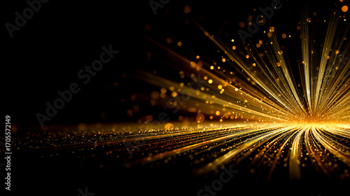 Obraz premium 右奥から流れるゴールドの光線とパーティクルが弧を描く抽象背景