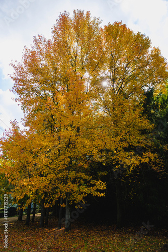 © shun, Fototapeta premium 深山公園、黄色い葉っぱが秋の雰囲気を演出する風景、岡山、日本