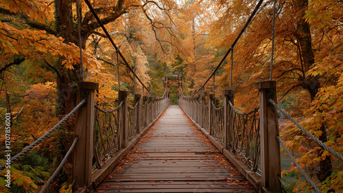 Obraz premium 秋色の森に続くまっすぐな吊り橋