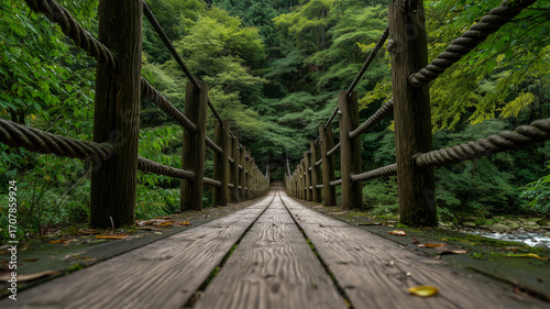 Fototapeta premium 深い森の吊り橋を正面構図で丁寧に撮影