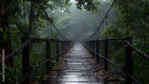 Obraz premium 雨上がりに濡れた森の吊り橋