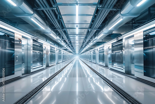 Obraz premium 近代的な製造現場の生産ラインクローズアップ(無人・清潔感)