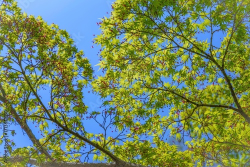 © Scott Mirror, Obraz premium 青空バックに見上げる新緑のモミジの若葉