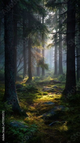 Obraz premium 神秘的な光が差し込む深い森の風景。自然や癒しのイメージに最適な森林写真。