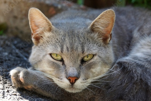 © butus, Naklejka premium Серый кот лежит на лапе и смотрит
