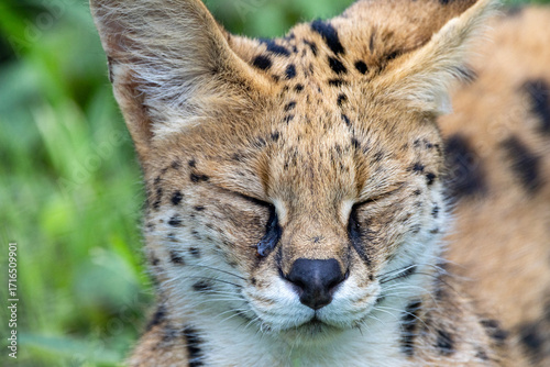 Fototapeta premium 目を瞑っているサーバルの正面