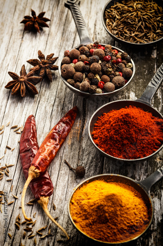 © alefat, Fototapeta premium Специи разного цвета на деревянном деревенском столе