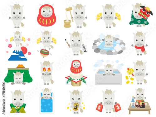 © R-DESIGN, Obraz premium いろいろなシーンの、白馬のキャラクターのイラストセット|午年素材