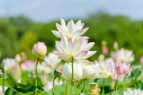 © Kazutaka, Fototapeta premium 夏の青空に映える白とピンクの蓮の花