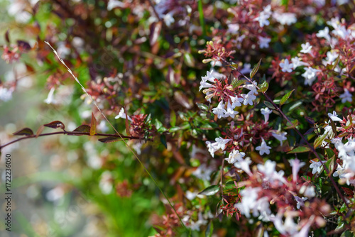 Obraz premium 赤い萼と白い花が咲くアベリア