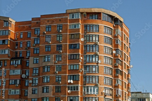 © butus, Fototapeta premium Коричневый многоэтажный дом с окнами и балконами на фоне неба