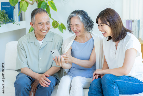 © wheeljack, Obraz premium リビングでスマホを見るシニア夫婦と子供