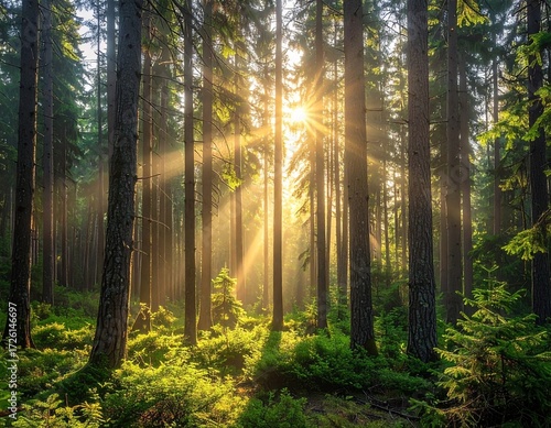 © japan runrun, Fototapeta premium 朝日が差し込む静かな森