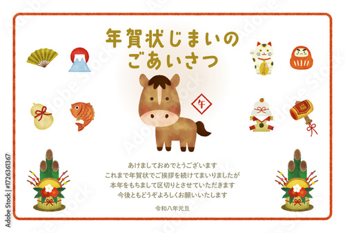 Fototapeta premium 水彩風 2026年・午年のかわいい馬の年賀状(年賀状じまい用メッセージ入り)
