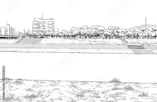 Fototapeta premium 漫画風ペン画イラスト 河川敷