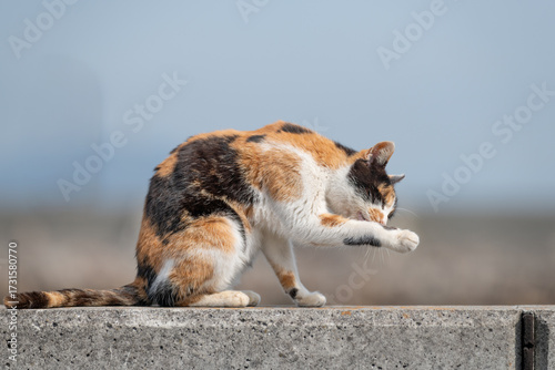 Obraz premium 堤防に座って毛繕いをする可愛い三毛猫