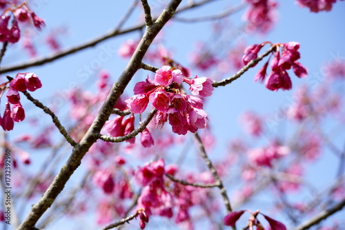 Obraz premium 青空を背景に濃いピンク色のカワヅザクラの密集した花が咲いている様子をクローズアップで捉えた写真です。春の訪れを感じさせる明るい色彩と生命力に満ちた風景です。