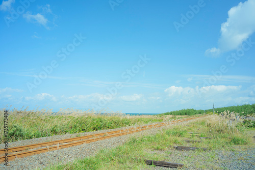 Obraz premium 秋晴れの陸奥湾と大湊線の線路 青森県横浜町 9月末