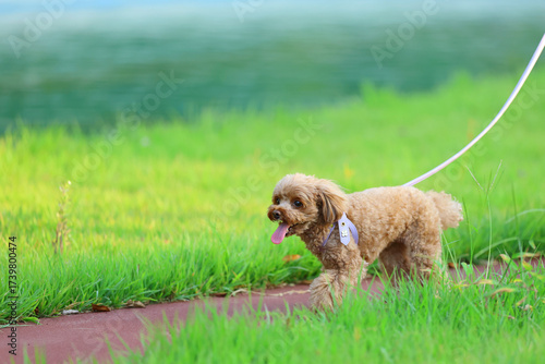 Fototapeta premium 芝生の綺麗な公園で散歩をしているトイ・プードル
