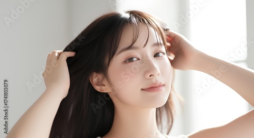 Fototapeta premium 柔らかな光に包まれた女性のヘアケアシーン