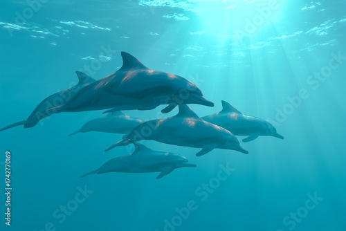 Naklejka premium 自由に泳ぐイルカの群れと青のグラデーション