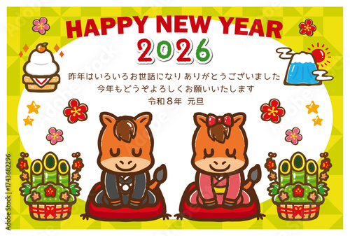© kiko, Fototapeta premium 着物姿で挨拶するかわいい馬の2026年の午年年賀状のイラスト素材2