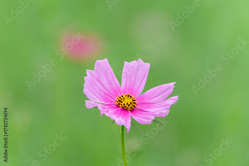 © Kazutaka, Obraz premium 緑の背景に映えるピンクのコスモスの花のクローズアップ