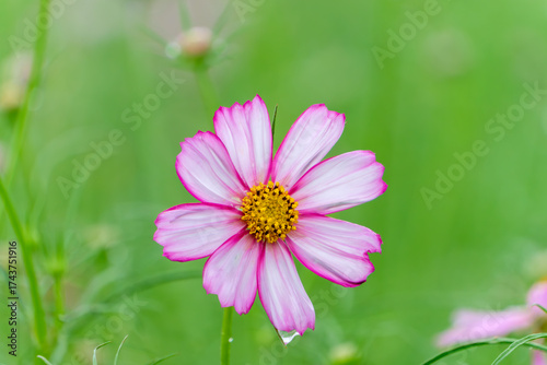 © Kazutaka, Obraz premium 雨上がりに咲くピンクと白のコスモスの花のマクロ撮影