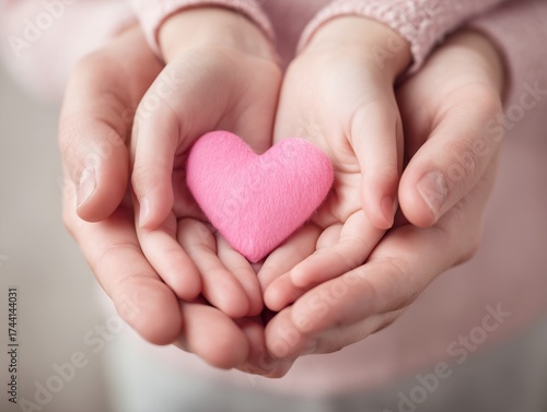 © Jumpei, Fototapeta premium 親子の手のひらに包まれたピンクのハートが優しさと愛情を象徴する温かい構図