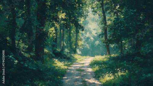 Obraz premium 朝の森の小道 柔らかな光に包まれた自然風景アート
