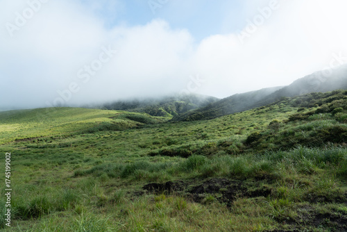 Fototapeta premium 霧がかった朝の草千里の丘