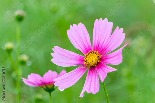 © Kazutaka, Obraz premium 雨上がりに咲くピンクのコスモスのクローズアップ