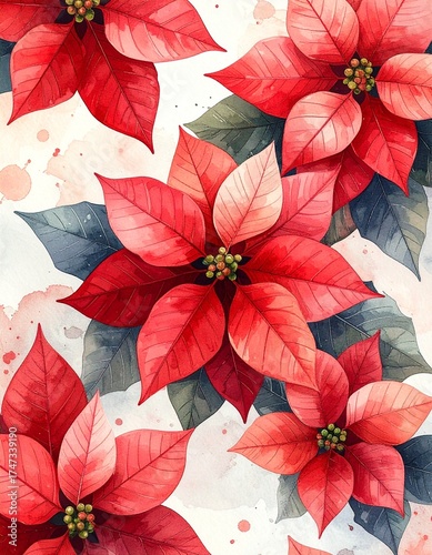 Obraz premium 水彩画風ポインセチアのやさしい背景|アート・年賀状・デザイン素材