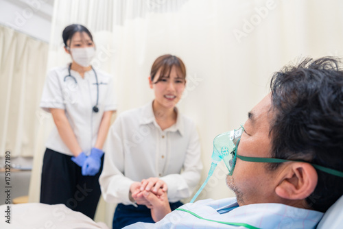 Obraz premium 人工呼吸器をつけた家族のお見舞いをする若い女性