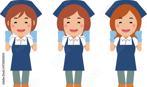 © キキセマルオ, Naklejka premium がんばります。と笑顔の紺色エプロンの女性清掃員
