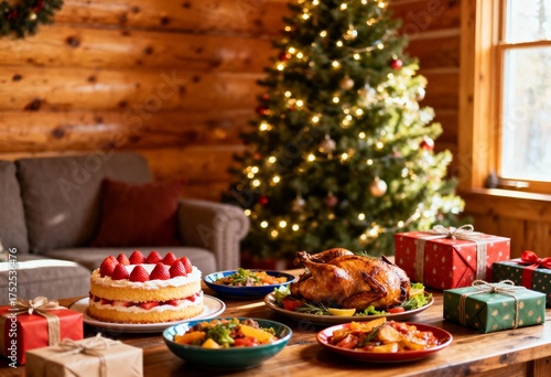 Naklejka premium 美しく輝くクリスマスツリーと苺のケーキと色とりどりの料理