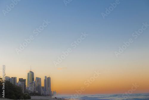 Obraz premium ゴールドコーストの海岸から見た都市部と夕暮れ