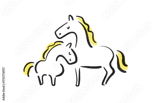 Obraz premium 眼を閉じて寄り添う白馬の親子 墨絵 2026