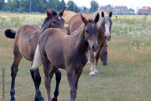 © butus, Obraz premium табун коричневых лошадей в цветущем поле в летний день