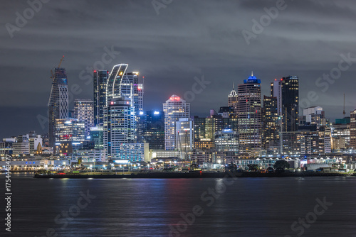 Obraz premium ニュージーランド オークランドの対岸から眺める市街地の夜景とライトアップされたスカイタワー