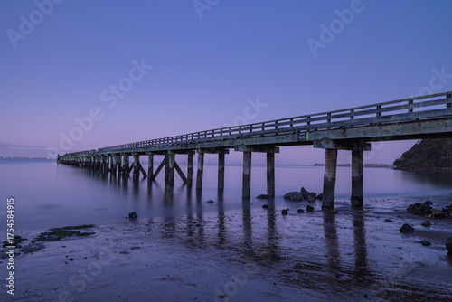 © pespiero, Fototapeta premium ニュージーランド オークランドの郊外にあるコーンウォリス・ビーチの桟橋の風景と黄昏時の空