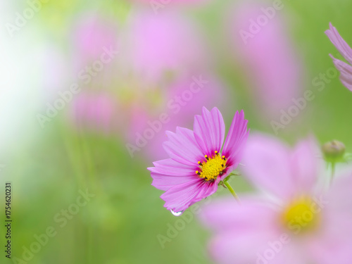© STOCK THE WORLD, Obraz premium 秋を彩るコスモスの花畑。小雨の中で静かに佇む、雨の雫のついたピンクのコスモス。自然風景。横構図